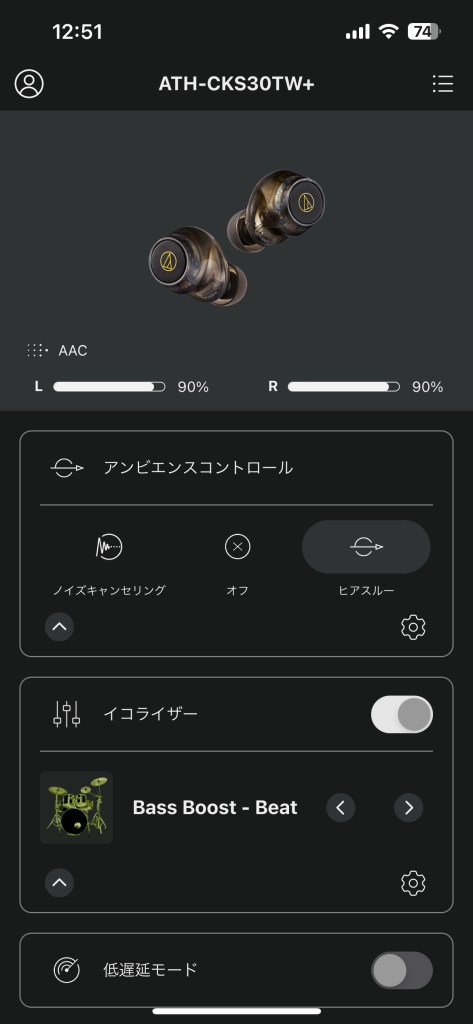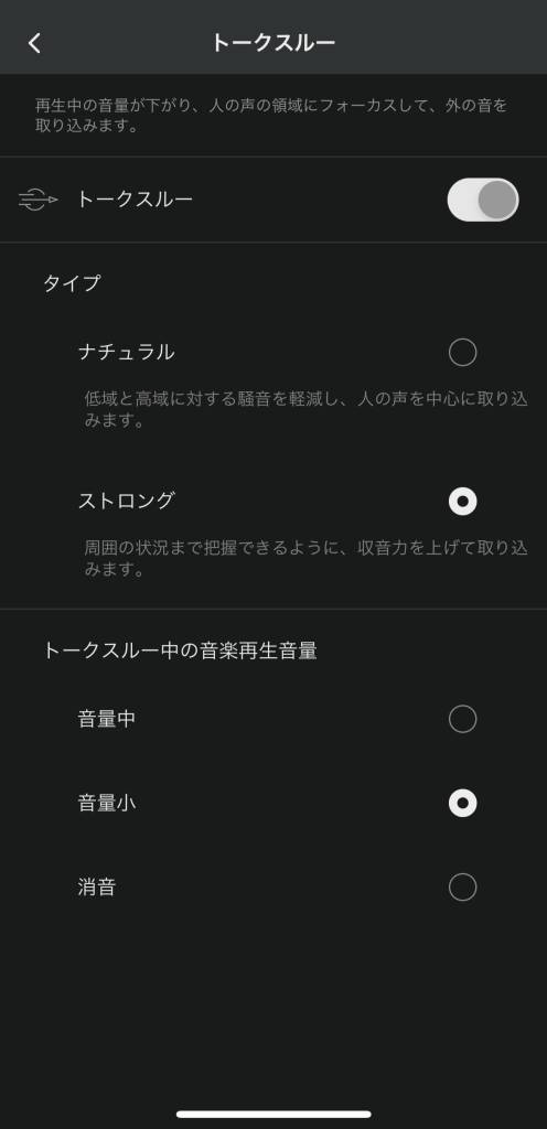 アプリ上の設定項目は以下の通り、ナチュラルにするとヒアスルーモードと同じくらいですが、ストロングはかなり外の音を取り込みます(体感イヤホンを外しているレベルです)