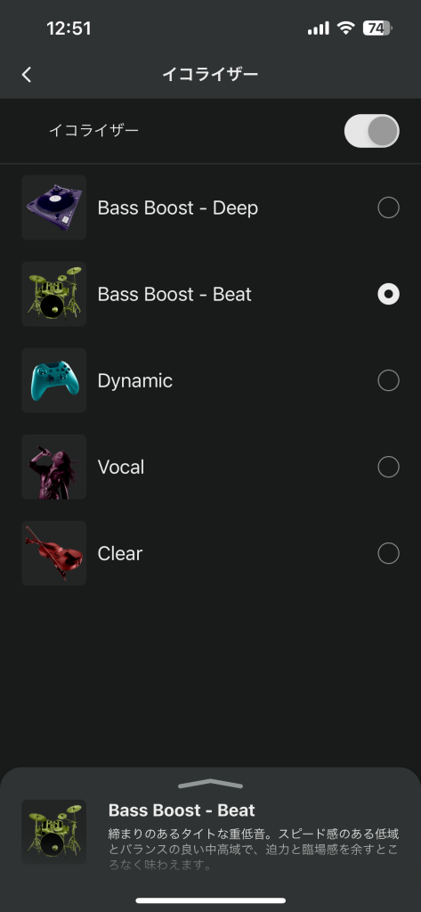 Bass Boost – Deepだと少しもっさりした感じになるので、個人的にはBass Boost -Beatがおすすめ