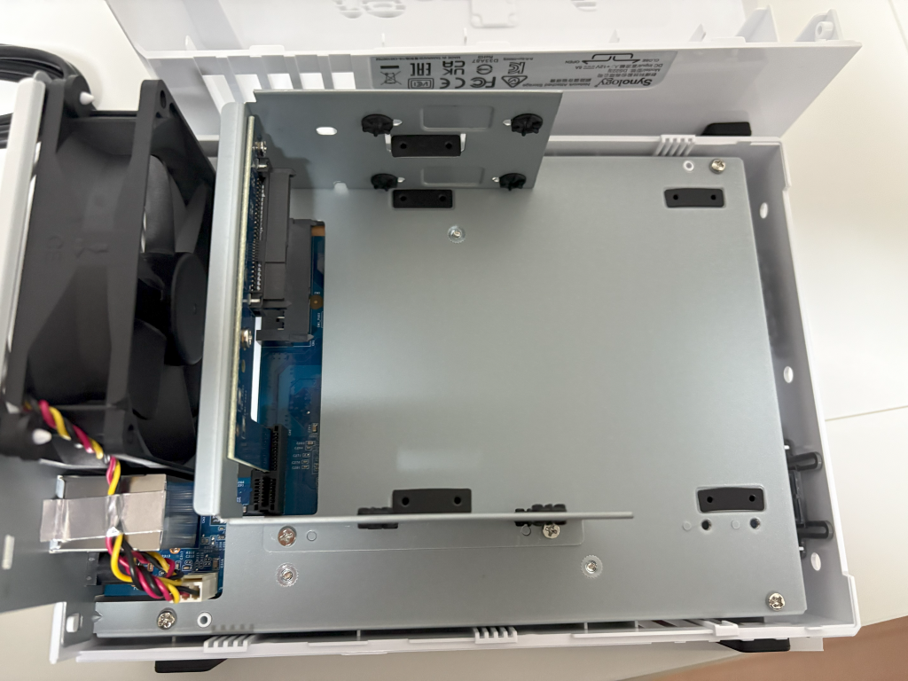 中を開けると画像のようになっているので、こちらにHDDを挿し込んでネジで止めていきます。