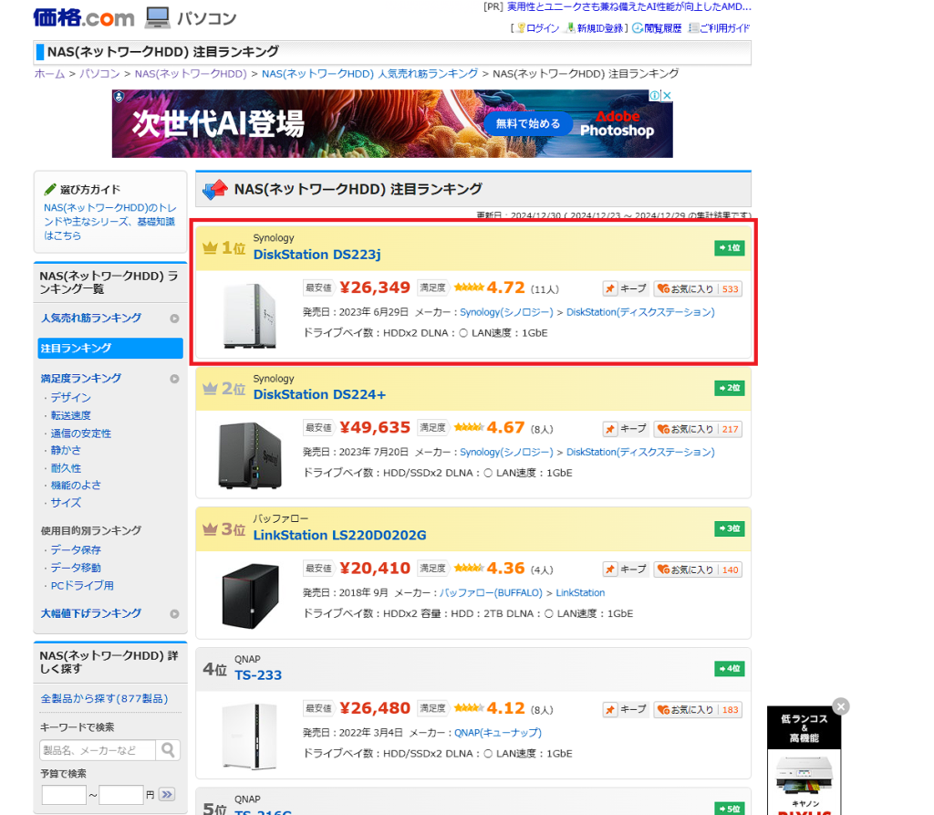 | 本体(Synology DS223j) | 26,482円 (2024/12/31時点amazon価格) |