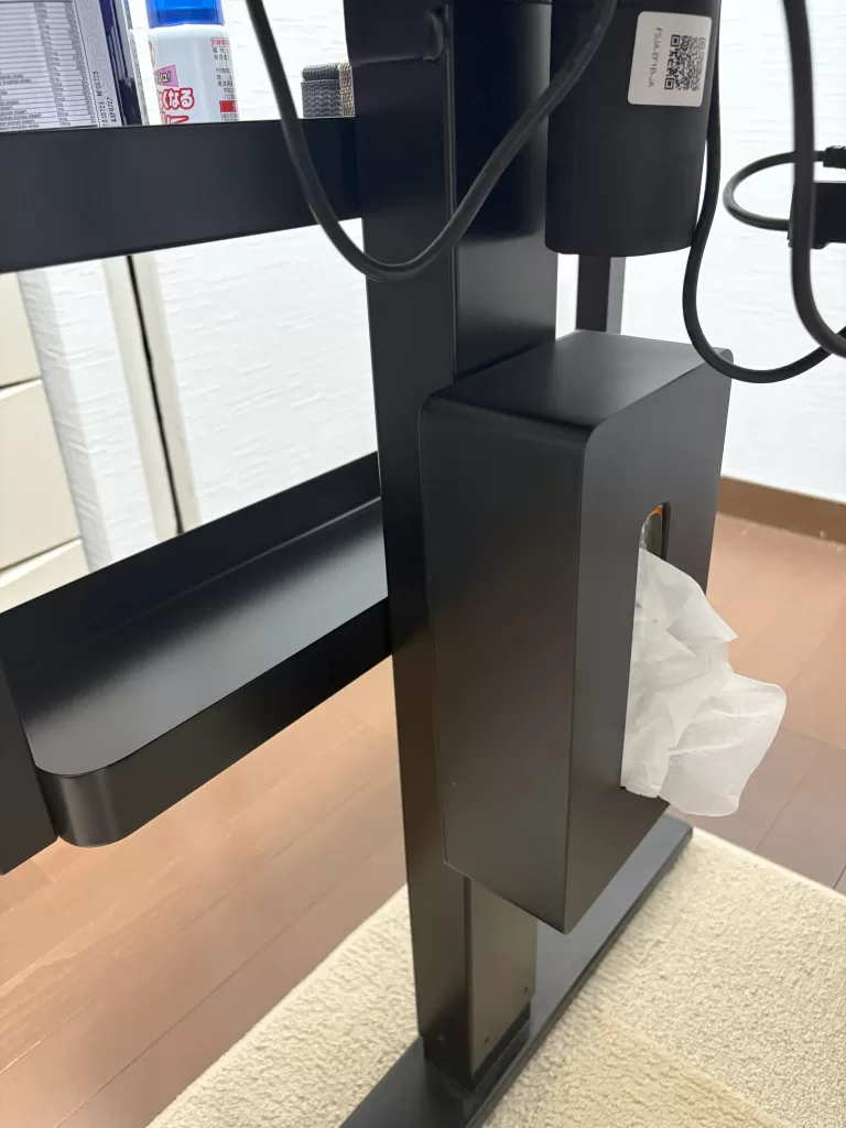 気になるマグネットですが、私はFlexispotの電動昇降デスクを利用していますが、このように足のところにペタッとくっつけることでテーブルの上に置いたりすることなく設置することができました。